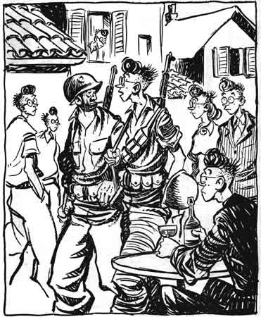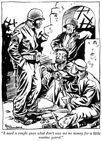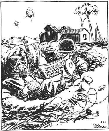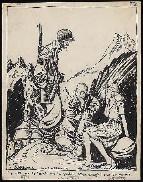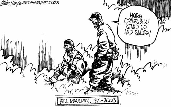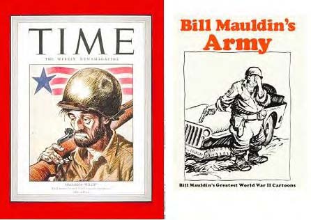 He was a kid cartoonist for Stars and Stripes, the military newspaper; Mauldin's drawings of his muddy, exhausted, whisker-stubbled infantrymen Willie and Joe were the voice of truth about what it was like on the front lines. Mauldin was an enlisted man just like the soldiers he drew for; his gripes were their gripes, his laughs their laughs, his heartaches their heartaches. He was one of them.