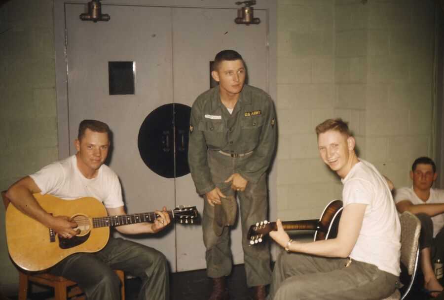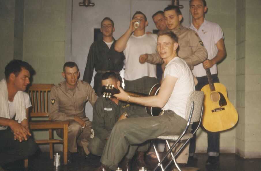 Kenneth Strong, Richard Ehler, Arnold Maass, Richard Christie, and in front playing the guitar is Calvin Carson.