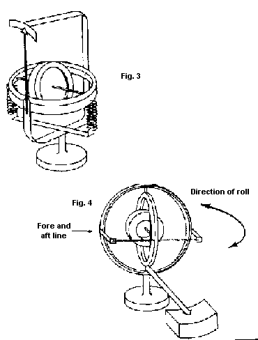 The gyroscope illustrated in Fig. 4 is used on ships to measure the rate of roll, i.e. the angular roll velocity. The spin axis is positioned at right angles to the fore-and-aft line and the rate of roll is measured about this line.
