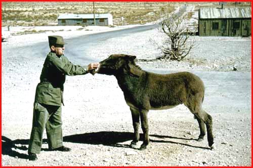 Nike trying to get the unknown soldier to either share his cigarette or outright give him one. The shrub/bush just above Nike is a mystery. It must have been there when the camp was first built because shrubs grow very slowly here in the desert. That is the Craft Shoppe down the street on the left.