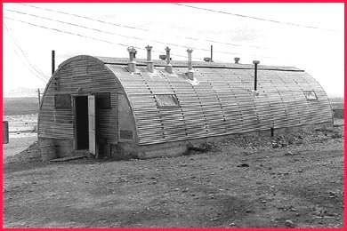 To fully appreciate this modern latrine, you had to use its predecessor, a 16 X 16 foot wooden hut straddling a deep trench, an unheated eight hole (four holes back-to-back) outhouse, reeking of lime. This new building had actual plumbing, toilets, showers, running water and heat! A water well had been drilled above and southwest of the camp which yielded a steady flow of non-potable alkaline water. However, it was good enough to flush toilets and charge the fire hydrant system of the camp. Water for drinking, cooking and the showers was trucked in daily from Carrizozo and stored in large railroad tank cars above the camp. This big Quonset Hut was one of the best improvements ever made to the camp. There were many Quonsets added in the camp's latter days, primarily for administrative buildings and BOQs. There were also some Quonsets downrange in the missile assembly and checkout area. Quonsets were mounted atop concrete foundations and if you visit the camp today, the foundations are about all that remain.