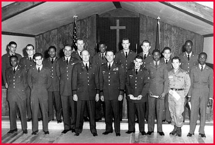 Ben Allgor, top left, received his college degree at this GED Awards Ceremony inside the camp chapel in January, 1959. There were some high ranking officers on hand to make the presentations. The officers are (L-R):