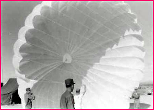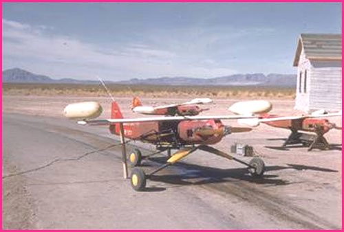 Pictured is an OQ-19B RCAT and below is its 38' recovery chute. The RCAT is on the "Rotary Launcher" which was a paved circular runway with a tether pole in the center to which the detachable trolley was attached. You can see the attaching cable coming off the drone and going toward the center of the Rotary. When the RCAT was ready to launch, the engine was started, fuel mixture set and it began taxiing around the track, always attached to the tether pole. A windsock was attached to a nearby pole and when the drone attained sufficient speed and was heading into the wind, the controller would release the drone from the trolley and off it would go, airborne. The M-33 Radar would lock onto the drone and the controller would go inside the van to fly the mission using the plotting boards to guide him.