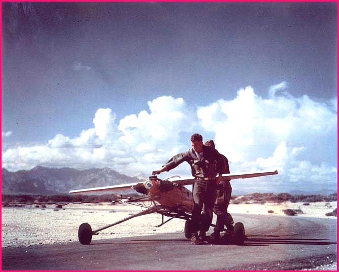 Launching RCATS from the Rotary Launcher was very dangerous business, as you can see in this photo. This drone is being prepared for launch, the engine is running full speed, the noise is deafening, and the blast of air from the spinning 44 inch wooden propeller is gale force. The man in front is between the invisible spinning propeller and the wing, adjusting the fuel mixture valve atop the 4-cylinder engine. The man in back is most likely the Radioman. There is a rod driven into the ground on the outside edge of the track. A cable goes from that rod to the trolley to keep it from moving. A lanyard is connected to the trolley end of the cable. When pulled, it releases the trolley.