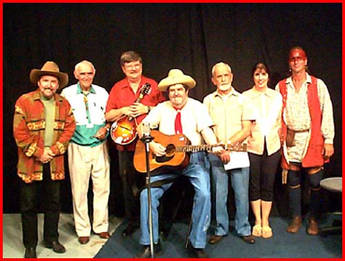 Ray E. Rutherford, better known as "Cuzn' Raye" or "Rawhide Raye, plays guitar during a July 2003 television production. Ray is also on a PBS TV show from Knoxville, TN every Saturday morning as a sidekick to Marshall Andy on the "Riders of the Silver Screen" Program.