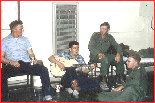 Ray Rutherford entertaining the troops at Red Canyon Range Camp in 1957. Alan Graham took this photo of Ray playing guitar, Billy Horner sitting nearest the bunk and Pete Engeman on the floor of the commo shack.. The man on the left is possibly named Thom. Ray, Alan, Billy and Pete were assigned to the Communications (Commo) Unit.