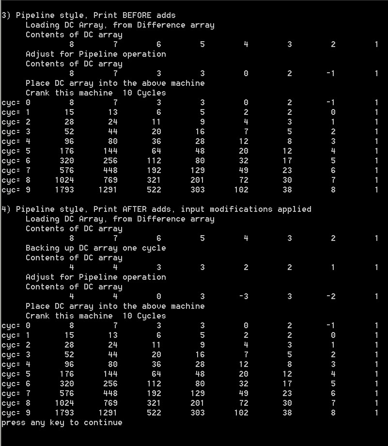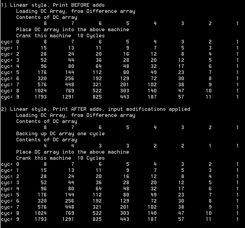 Difference EnginesThe BASIC code below is in 4 parts See below The screen shots are shown in two parts Two linear machines, not pipelined, the top printing before additions, the bottom printing after additions - note the adjustments to back up one step before inserting values into the machine Two pipelined machines, both have inputs adjusted to allow the pipelining the top printing before additions, the bottom printing after additions - note the adjustments to back up one step before adjusting for pipelining before inserting values into the machine Note: the bottom pipelined machine simulates the Babbage Difference Engine II that is, it prints after doing add into DC0 Of course, the adjustments to the inputs are made before setting up the actual machine. In the file:///C:/0-Net/bab/Babbage7-OutputCropped.jpg ATTACHMENT, only the cyc= value and the polynomial value are shown '----------------- Start of BASIC CODE ------------- ' name Babbage7-02.bas ' ' enhanced explanations ' ' Problem: ' - because the Babbage engine prints AFTER adding, ' the effect is that the first value printed ' is actually the second value expected from a ' simple difference engine as exemplified by ' "6. A simple example of the Method of Finite Differences" ' ' Note: another problem, already solved, is that the ' initial Difference Column values from ' "6. A simple example of the Method of Finite Differences" ' need to be modified to allow "correct" operation of ' the Babbage "pipeline" operation. ' ' GOAL: '- provide a verification of simulation of the ' Babbage Difference Engine # 2 ' using: ' limited accuracy (64 bit) ' binary binary rather than decimal ' ' METHOD: ' - Use 4 simulations, one after the other, ranging from ' 1) a very simple "linear" easy to verify Difference Engine (DE) ' 2) the simple DE with post add printing ' 3) a DE with Babbage style "pipeline" with pre-add printing ' 4) a DE with Babbage style "pipeline" with post-add printing ' - Using a set of very simple unique difference values ' to easily track the operation sequences in the simulations ' - Demonstrating that with the required input modifications, ' the results (printing) will be identical ' and identical to the outputs expected from ' "6. A simple example of the Method of Finite Differences" ' ' OPTION EXPLICIT DEFLNG A-Z ' default to 64 bit variables CONST NumDC=8 ' number of Difference Columns DIM I ' counters DIM Cycle = 0 ' working temp value CONST CycLim =10 DIM DifAy(NumDC) ' input array DifAy(0) = 8 DifAy(1) = 7 DifAy(2) = 6 DifAy(3) = 5 DifAy(4) = 4 DifAy(5) = 3 DifAy(6) = 2 DifAy(7) = 1 Dim DC(NumDC) ' array of Difference Columns '-------------------------------- ' 1) a very simple "linear" easy to verify Difference Engine (DE) PRINT PRINT "1) Linear style, Print BEFORE adds" GoSub LoadDCArray PRINT " Place DC array into the above machine" Print " Crank this machine ";CycLim;" Cycles " Cycle = 0 while cycle < CycLim GoSub PrintCycle for I = 0 to NumDC-2 DC(I) += DC(I+1) next I Cycle += 1 Wend '-------------------------------- ' 2) the simple DE with post add printing PRINT PRINT "2) Linear style, Print AFTER adds, input modifications applied" GoSub LoadDCArray GoSub BackUpOneCycle ' back up for print second PRINT " Place DC array into the above machine" Print " Crank this machine ";CycLim;" Cycles " Cycle = 0 while cycle < CycLim for I = 0 to NumDC-2 DC(I) += DC(I+1) next I GoSub PrintCycle Cycle += 1 Wend '-------------------------------- ' 3) a DE with Babbage style "pipeline" with pre-add printing PRINT PRINT "3) Pipeline style, Print BEFORE adds" GoSub LoadDCArray GoSub AdjustForPipeline PRINT " Place DC array into the above machine" Print " Crank this machine ";CycLim;" Cycles " Cycle = 0 while cycle < CycLim GoSub PrintCycle DC(0)+=DC(1): DC(2)+=DC(3): DC(4)+=DC(5): DC(6)+=DC(7) DC(1)+=DC(2): DC(3)+=DC(4): DC(5)+=DC(6) Cycle += 1 Wend '-------------------------------- ' 4) a DE with Babbage style "pipeline" with post-add printing PRINT PRINT "4) Pipeline style, Print AFTER adds, input modifications applied" ' GoSub LoadDCArray ' back up for print second GoSub BackUpOneCycle ' back up for print second ' start back-off for pipeline operation GoSub AdjustForPipeline PRINT " Place DC array into the above machine" Print " Crank this machine ";CycLim;" Cycles " Cycle = 0 while cycle < CycLim DC(0)+=DC(1): DC(2)+=DC(3): DC(4)+=DC(5): DC(6)+=DC(7) DC(1)+=DC(2): DC(3)+=DC(4): DC(5)+=DC(6) GoSub PrintCycle Cycle += 1 Wend '-------------------------------- GoTo ExitLoop LoadDCArray: PRINT " Loading DC Array, from Difference array for I = 0 to NumDC-1 ' copy difference array into DC array DC(I) = DifAy(I) Next i GoSub PrintDCArray Return PrintDCArray: PRINT " Contents of DC array" PRINT " "; for I = 0 to NumDC-1 PRINT USING " ########"; DC(I); NEXT I PRINT Return PrintCycle: print using "cyc=##"; cycle; for I = 0 to NumDC-1 PRINT USING " ########"; DC(I); NEXT I Print Return BackUpOneCycle: ' back up for print second PRINT " Backing up DC array one cycle" for I = NumDC-2 to 0 step -1 DC(i) = DC(i) - DC(i+1) next i GoSub PrintDCArray Return AdjustForPipeline: ' start back-off for pipeline operation PRINT " Adjust for Pipeline operation" DC(6)=DC(6)-DC(7) ' back off iteration 3, 1st half cycle DC(5)=DC(5)-DC(6) ' back off iteration 2, 2nd half cycle DC(6)=DC(6)-DC(7) ' , 1st half cycle DC(4)=DC(4)-DC(5) DC(3)=DC(3)-DC(4) ' back off iteration 1, 2nd half cycle DC(5)=DC(5)-DC(6) DC(2)=DC(2)-DC(3) ' , 1st half cycle DC(4)=DC(4)-DC(5) DC(6)=DC(6)-DC(7) GoSub PrintDCArray Return '------------------------------------ ExitLoop: Print "press any key to continue " DIM k$ ' keyboard control input character While K$ = "" k$ = LCASE$(INKEY$) sleep 1 WEND END '