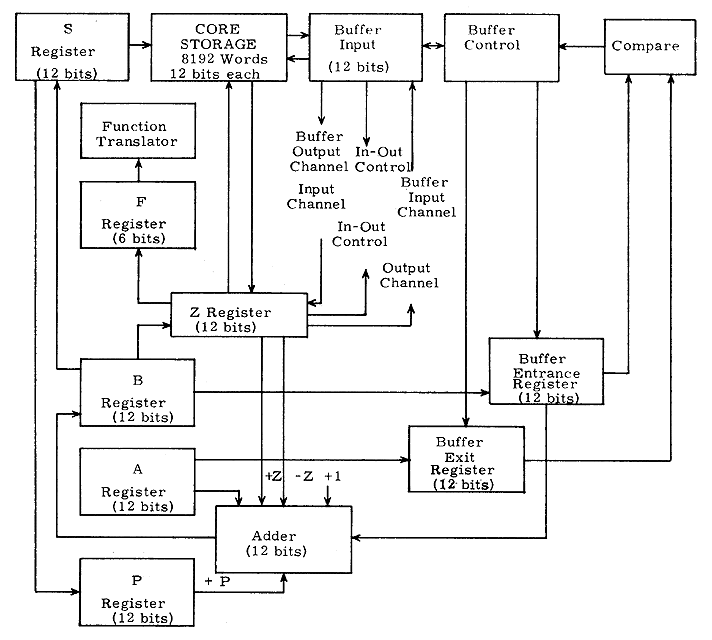 The input-output buffer register provides temporary storage for a 12 - bit word between computer memory and selected external devices. The buffer control contains a 12-bit entrance register and a 12-bit exit register which must be preset by the program. The entrance register contains the address of the memory location for the input or output word being transferred at any time during a buffered input-output operation. This register is s advanced by one each time a word is transferred. The exit register contains the input or output terminating address plus one. The contents of t h this s register is constantly compared with that of the entrance register and when comparison detects identity, the buffered input-output operation ceases.