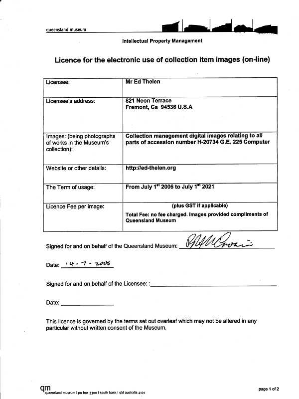 On July 6th, 2006, Peter Volk - Assistant Collection Manager of the Queensland Museum (South Brisbane, Australia, phone +61 (0)7 3840 7555) e-mailed me saying that there was a GE-225 in good condition in that institution. He asked if I could verify the identification of various components, and sent images of that machine. Image permissions