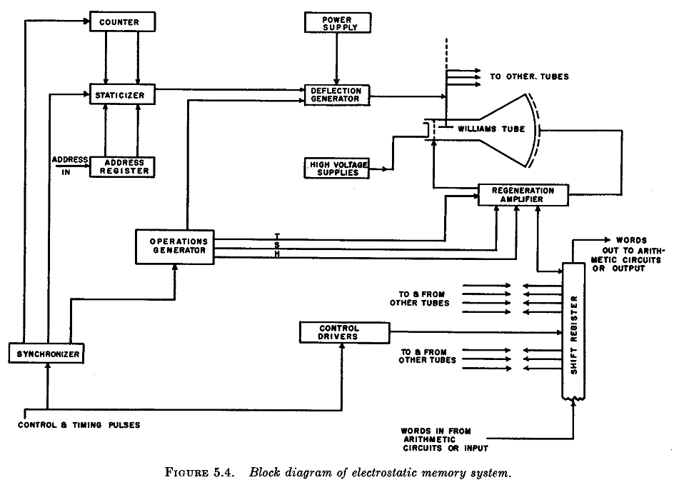 In the SEAC Williams memory,3 each tube is assigned one particular digit of the 45 binary digits making up a word that can be either an instruction or a number. (The other three of the 48 positions in the SEAC word are spares.) All of the digits of one word are assigned the same relative positions in the array of 512 stored spots on each tube. Figure 5.4 is a block diagram of the SEAC electrostatic memory system.