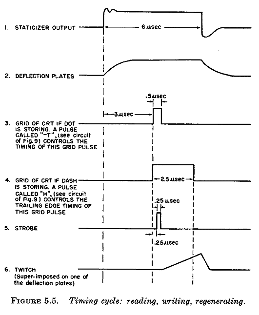 Since the act of reading causes all spots to be written to "zero," the "ones," must be restored. To accomplish this, at the end of the DOT pulse all tubes are provided with a sawtooth deflection pulse which displaces the beam about one spot-diameter. If the output from any tube is positive at STROBE time, the beam is held on by the DASH pulse which occurs during the TWITCH. The spot charged during reading is then discharged by secondaries from under the moving beam and a one is thus restored. If the output of the tube is negative, a zero has been sensed and rewritten during DOT so that no other action is needed. The absence of the positive output prevents the beam from being held on during the TWITCH and the spot is left charged. The total time allowed for this read-write operation is three microseconds. An additional time of 6 usec is required to allow the staticizer pulse to swing back, making a total operation time of 12 usec, 3 for deflection, 3 for read and rewrite, and 6 for flyback. Writing is done in similar fashion. The information is stored in the shift register and is used in place of the output of the amplifier to control the holding on of the beam during TWITCH.