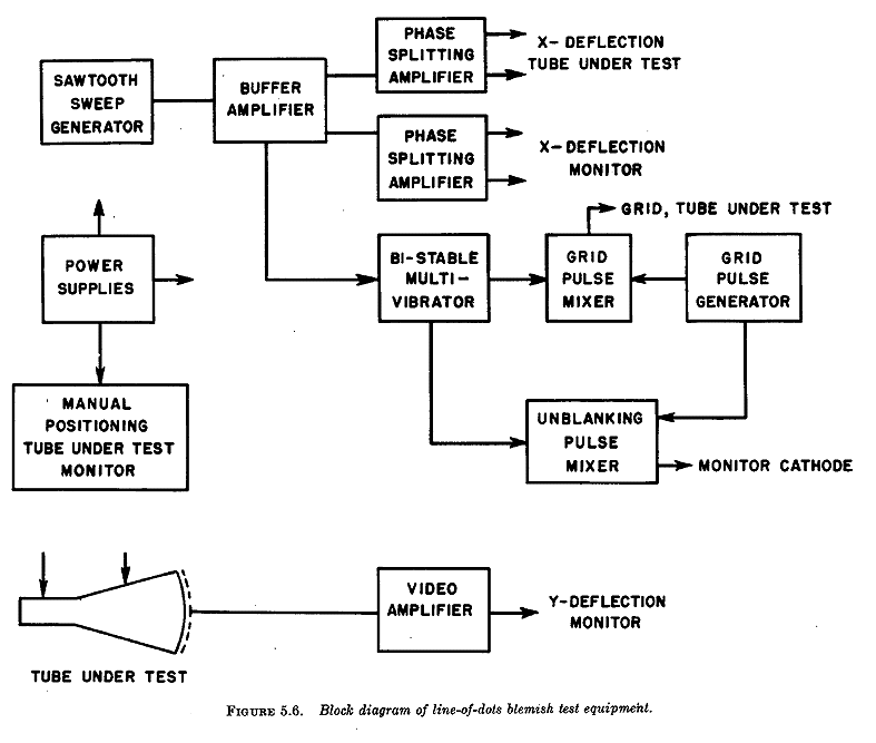 The Line-of-Dots test operates as follows: The beam is turned on and swept across the horizontal axis of the tube under test during the first half of the cycle. During the second half-cycle the beam is swept across the same line, but the beam is turned on only during 10 very short periods. During each one of these short periods the screen on the front of the tube picks up a positive-going signal which is very similar to the usual "dash" signal. These periods are nonsynchronous with the sweep, so that the entire line is interrogated during successive sweeps. When displayed on the vertical axis of a synchronized monitor, the envelope of the dash signals will show a notch or dip at a point where there is a blemish. The block diagram of this equipment is shown in figure 5.6.