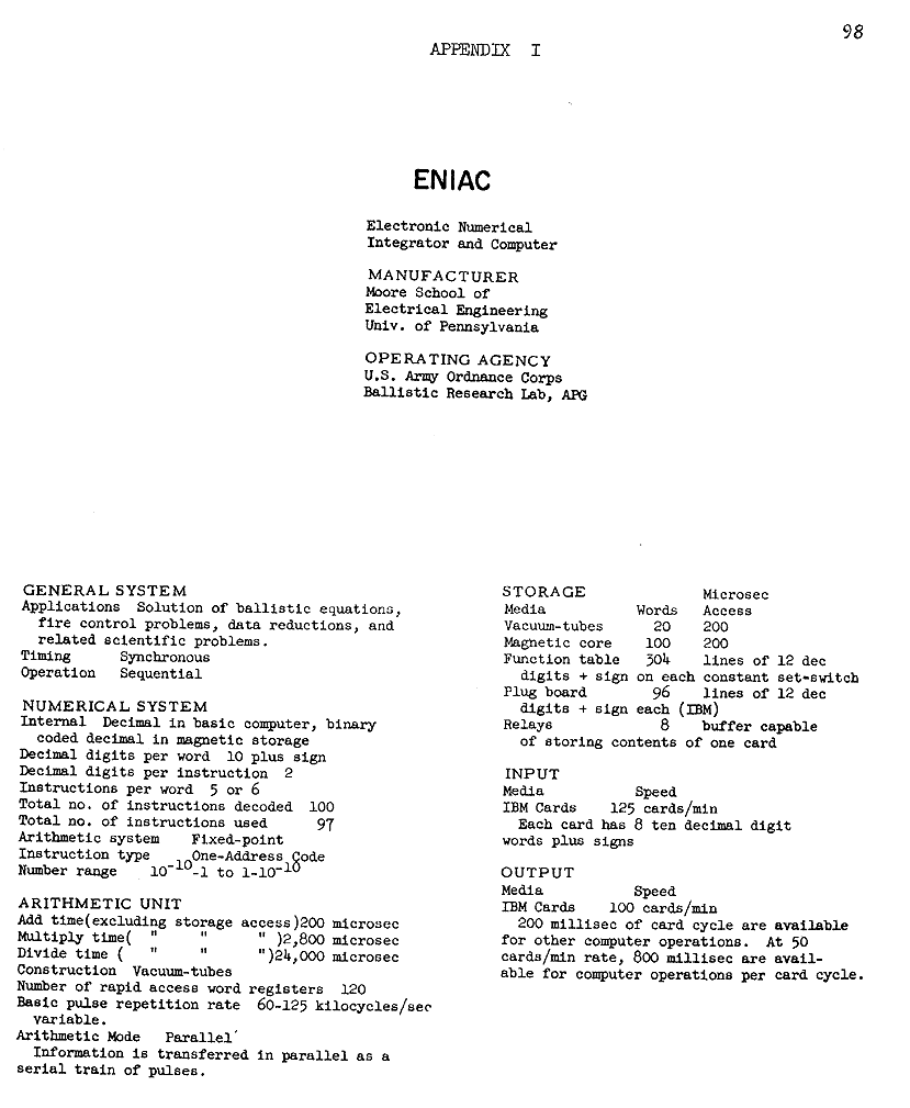 - The ENIAC Story, by H. H. Goldstine, P. N. Gillon, and and M. H. Weik.