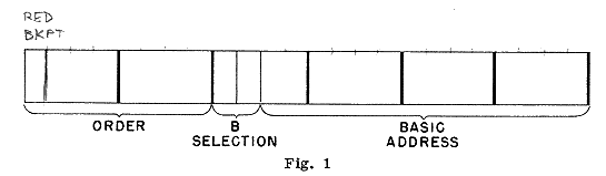 More specifically, an instructional word consists of two half-word instructions, each having six tetrads of four bits each (see Fig. 1). The first two tetrads of an instruction constitute an order, according to the vocabulary given below. The last four tetrads (16 bits) furnish an address (or some other number relevant to the particular order) in the following way: The first two bits select a B register (BO, the zeroth B register, is a mythical register defined as containing 0 at all times). The contents of the last 14 bits are then added to the contents of the selected B register to furnish the Effective Address. [Note that some instructions, such as (R) to U, are completely specified by the order tetrads; for these, the last four tetrads are ignored.]
