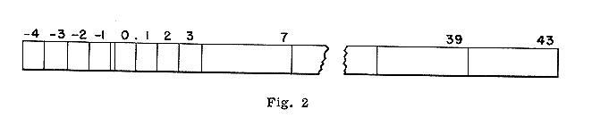 An operand is by nature simply a collection of 48 bits of information, which can be interpreted and modified in any finite way by the available vocabulary. In the majority of cases, however, it 13 treated as a number. The bits of a number, or the stages of an arithmetic register holding a number, are designated as shown in Fig. 2.