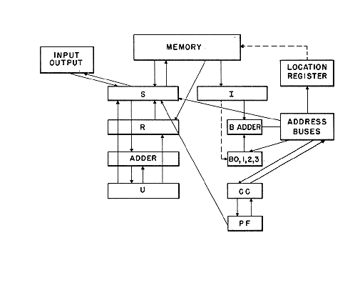 The Instruction Register, I, receives instructions from the storage. Its Order Part, O, communicates with the decoding circuits; its B part selects an index register; and its Address Part, A, furnishes input to the B Adder, B+. The B Registers, Bl, B2, and B3, contain address modifiers (indices), which they gate into B+ whenever selected. B+ communicates with the memory address buses. The Control Counter, CC, also communicates with the address buses, and governs the fetching of instructions. CC can be set by B+ to effect transfers of control.