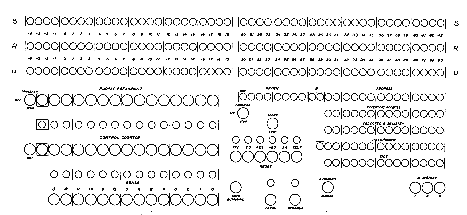 The three rows of 48 lights at the top of the control panel display the current binary contents of S, R, and U. They are divided for easy reading in tetrads. Below this and to the right is a row of 24 lights displaying the current instruction. Whether or not this instruction has been performed is indicated by lights over the Fetch and Perform Switches (see below). Immediately below this are two rows of 14 lights. The lower row displays the current contents of the B Register that is selected by the current instruction.