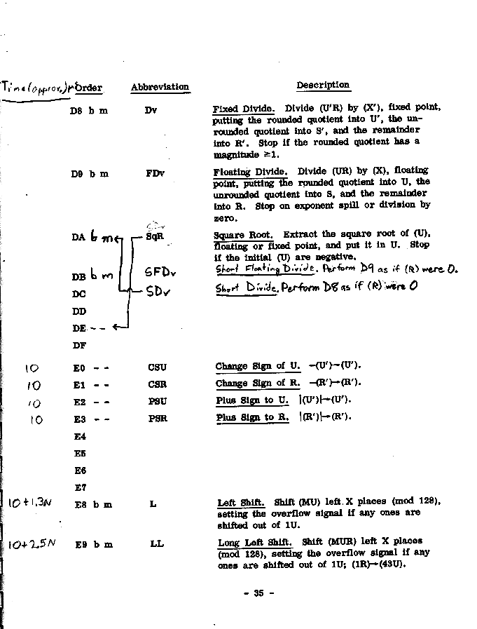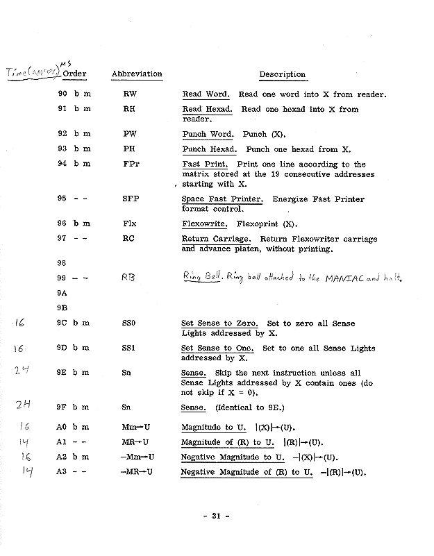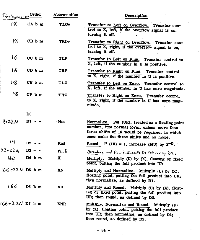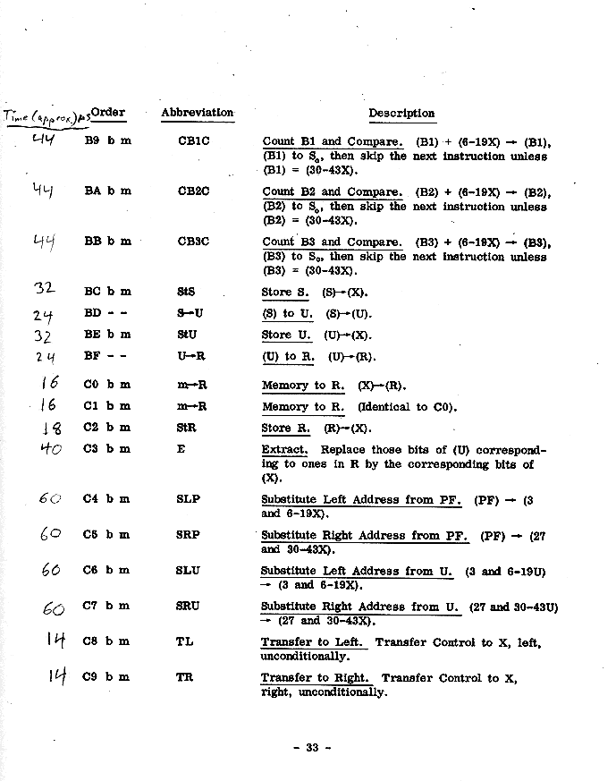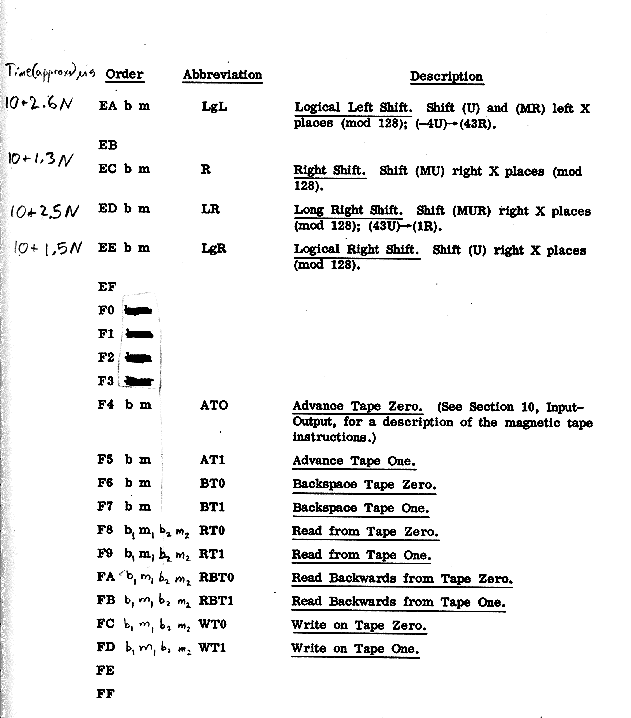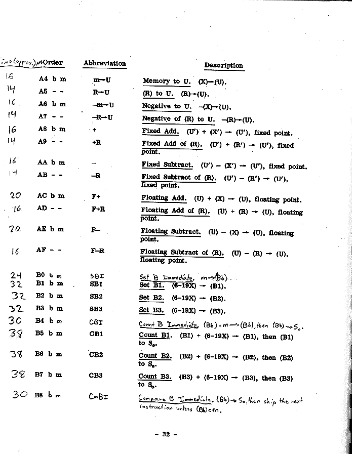 U Universal register R R register S S register m Appropriate memory location \ | E Exponent bits (-4 through 1) | after completion of | the order ó Sign bit (0) | | M Magnitude bits (1-43) / -- Contents unchanged a Answer i.e., primary result of operation _ Z Reflection of Z, any Z. Z' Contents of Z before the order was performed.Page 48 register contents, about 25 K Bytes
