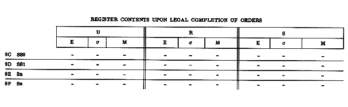 It frequently happens that the contents of a part of a register are unchanged by the performance of an order. This state of affairs is indicated by a dash (—) in the appropriate spot in the table.