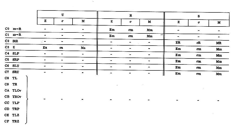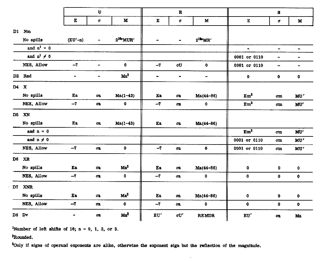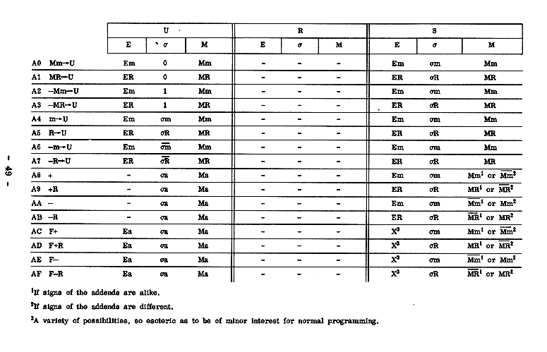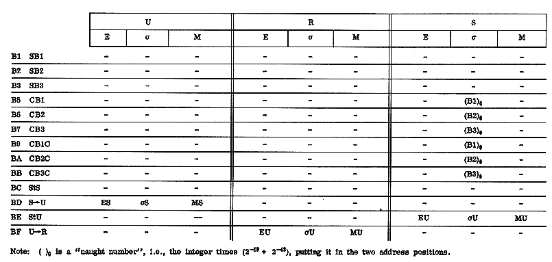 The contents of the registers upon completion of an order are, for the most part, described in terms of the contents at this same time of other registers, or of the appropriately B-modified memory location addressed by the order. For this latter, the symbol m is used. Thus, if the entry EU occurs in the E column of R, one should read this as: "The contents of the exponent-bits of R at the completion of this order are identical to the contents of the exponent bits of U at this time." Or, if in the M column of the S register is found the notation Mm, this says: "The contents of the magnitude bits of S upon completion of this order will be identical to the final contents of the magnitude bits of the appropriately B-modified memory location addressed by this order."