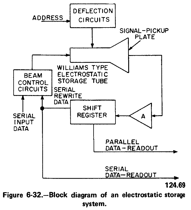 Electrostatic storage, as performed with the aid of cathode-ray type tubes and associated circuitry, can provide a memory with access time of the order of a few microseconds and storage capacities of about 1,000 bits per linear inch.Williams Tube