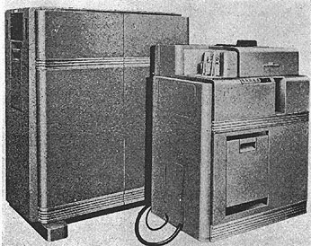 PLUGGABLE CONTROL PANELThe heart of the CPC is the type 604 arithmetic unit, shown in Figure 1. This is an electronic unit of approximately 1,400 tubes containing electronic storage units, an elec tronic accumulator of 13 positions, and electronic timing and control circuits which will control the operation of the unit at an operating frequency of 50,000 pulses per second. The fundamental electronic operations provided are addition, subtraction, multiplication, and division, which may be used singly or in any combination under control of a wired program established by the user of the machine. The extreme flexibility of the arithmetic unit itself arises from the use of a pluggable control panel; that is, a control panel for which all connections can easily be made by hand. This makes it possible to have one control panel wired for floating decimal operations, with factors carried as significant figures times a power of ten; one for fixed decimal operations; one for special functions such as trigonometric and logarithmic; one for matrix inversion; one for selfchecking, for example, by casting out 99's; et cetera. Often a considerable saving in time for a specific purpose can be obtained by wiring a control panel specially tailored for the problem. These control panels are separate units inserted into the calculator, so they may be interchanged readily. Effectively, they tell the arithmetic unit what to do at electronic speeds with the factors it has received at electromechanical speeds. In other words, operation of the arithmetic unit may be thought of as taking place in two phases: