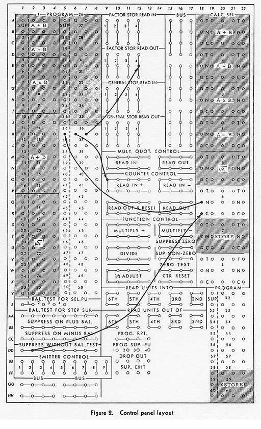 Figure 2. Control panel layoutFigure 2 shows the layout of the control panel, built up by plugging the necessary wires into the connection holes. On it 60 single-address commands or program steps are provided for manipulating the factors read into the arithmetic unit. To carry these out there is an electronic counter of 13 decimal positions and 37 positions of electronic memory, all interconnected by an 8-digit channel system. A typical command may then be, "add the contents of electronic storage unit number 4 into the counter." This is illustrated in Figure 2 for program step number 36. The following commands are available: Storage read in Storage read out Multiplier quotient unit read in Multiplier quotient unit read out Counter read in plus Counter read in minus Counter read out Counter read out and reset Multiply plus Multiply minus Divide One-half adjust Zero test for step suppression Column shift Sign test for step suppression Group suppress Program repeat Zero test, sign test, and group suppress enable designated groups of program steps to be suppressed selectively. These commands are specified by inserting a properly wired control panel into the machine. Various combinations of them may be selected by means of relays picked up by the operation instruction in each line of instruction. These relays are called calculate selectors, abbreviated calc. sel. on the wiring diagram. The wiring shown passing through calculate selector number 6 will make program step 36 active with an operation 6 instruction. The wiring diagram, still Figure 2, shows how groups of steps are associated with calculate selectors to form operations in a general purpose 8-digit control panel. Thus it is possible for a single general-purpose control panel to offer a choice of the following: add, subtract, multiply, divide, sin x, cos x, hyperbolic sine, hyperbolic cosine, exponential, logarithmic, or square root functions, and other functions. Ten by ten multiplication is performed by a partial products expansion. Ten by ten division is done by a quotient expansion. The calculation of special functions such as sin x and square root is effected by series expansions or iteration formulas. The program repeat feature of the machine enables one to carry out these series or formulas at electronic speeds. This provides for a repetition, at electronic speeds, of all 60 program steps if specified conditions are not met. For example, if an approximate value generated for the square root does not agree closely enough with the previous approximation, the iteration will be carried out again. A control panel utilizing all 60 program steps can be wired from a planning chart in 2 hours. Having a pluggable interchangeable arithmetic control panel best enables the user to tailor his own machine to his own problem. STORAGE UNITS AND THEIR INTERCONNECTIONS