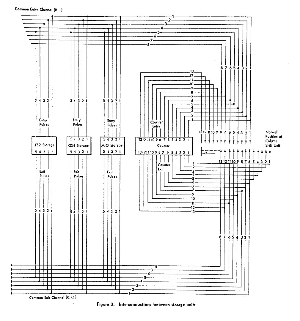 Figure 3. Interconnections between storage unit:Figure 3 shows the interconnections between two typical storage units, the multiplier quotient (MQ) unit, and the counter. There is an eight digit channel for entry and exit from the storage and multiplier quotient units. These units may be connected into the channel in various ways by wiring on the control panels. The so-called normal assignment is the one shown. Information leaving a storage unit passes to the column shift unit where a shift left of zero to five digits may be effected before the information enters the counter or another storage unit. The column shift unit is controlled by the tertiary timer, to be discussed later, during multiplication and division and by control panel wiring during other operations. Information leaving the counter also passes into the shift unit, with the shift homed on the high positions of the counter, that is, position 6 of the counter connected to the units position of the channel. Thus a shift of from zero to five digits right may be effected. In this way the same shift unit serves for both right and left shifting. TIMING