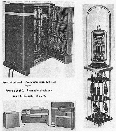 Figure 4 shows a rear view of the.arithmetic unit with the left gate open as for servicing. The program steps are located in the detachable rows of panel 2. Storage units are similarly located in panels 4 and 6. Panels 1, 3, and 5 in the right gate contain the secondary timer, tertiary timer, counter, and other special circuits. Figure 5 shows one of the pluggable circuit units used in the arithmetic unit. The resistors and condensers in the circuit associated with a given tube are mounted in the assembly with that tube. Connections are made with the row chassis by means of a f3-prong plug. These pluggable units facilitate mass production. They also facilitate maintenance because the IBM customer engineer can trace difficulties by functional failure and easily replace the entire unit. Over-all Operation of the CPC