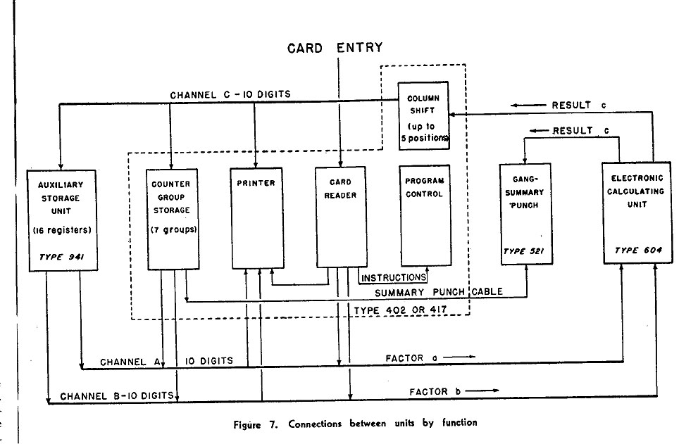 Figure 7. Connections between units by functionFigure 7 shows the connections between these units arranged by function. The electronic calculating unit at the right has already been described as the center of the CPC. The counter group storage, the line printer, the card reader, the column-shift unit, and the program control are located physically in the type 402-417 electric accounting machine. Normal operation is with numbers of ten decimal digits and algebraic sign. There are 80 counter positions in the counter group storage. Each type 941 auxiliary memory unit has a capacity for 16 such numbers, and up to three type 941's may be provided, for a total auxiliary memory of 480 digits plus 48 signs. Both the electric accounting machine and the auxiliary memory unit operate by means of relays, cams, counter wheels, et cetera, and may be classified as electromechanical devices. The fundamental cycle for the operation of these units is 400 milliseconds. Thus there are two basic periods for operation in the CPC, namely, 400 milliseconds when dealing with the electromechanical units of the calculator, and 0.5 millisecond when dealing with the electronic component. Clearly it is the object of the programmer to load up the electronic unit with as much information as possible, so as to minimize the number of electromechanical cycles. For problems which do not involve the calculation of special functions, the average time per operation can often be reduced to 150 milliseconds. When the program repeat feature of the arithmetic unit is being used to calculate special functions, the average time per operation may become as low as 10 milliseconds. The electromechanical units are connected to the type 604 electronic calculator (arithmetic unit) by three channels, each carrying 10-decimal-digit numbers with sign (see Figure 7). The first two of these, channels A and B, carry factors and instructions to the electronic unit. The third, channel C, brings information from the electronic unit. Thus a series of calculations is normally reduced to steps of the logical form: a (operation) b yields c, where a and b are any numbers (constants, data, and previous results) to be combined by a specified operation (arithmetic, trigonometric, exponential, or other), and c is the result of this combination. In other words, the CPC operates with a 3-address coding system, normally read from cards. Each line of instruction contains the following: