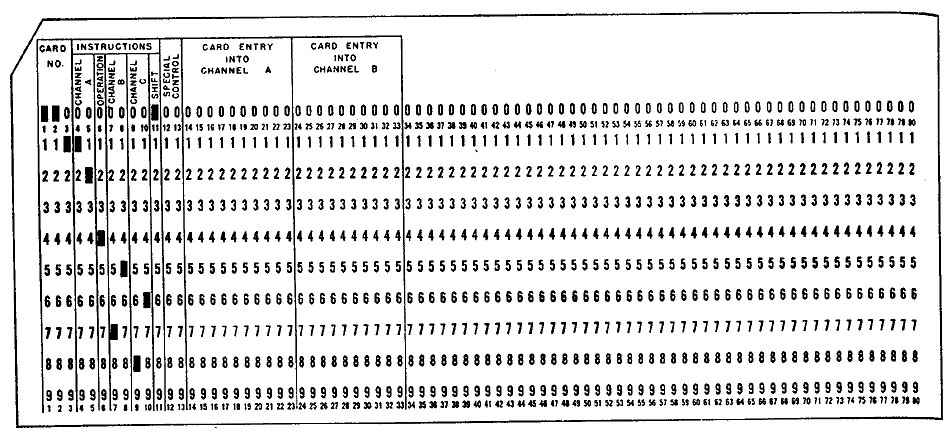The CPC operates using standard IBM punched cards. These are an economical, reliable, and flexible medium for intermediate and long-time storage of information. Cards are easy to reorder and merge using standard IBM auxiliary equipment. A typical instruction card is shown in Figure 8. Note that it provides a full line of instructions, together with room for the introduction of one or two factors, variables or constants, to be read into the machine from the card. This leaves machine memory free for current operations. In effect, the instruction deck and interfiled data cards serve as an extensive auxiliary memory. With this brief description of the overall operation of the CPC, and having pointed out some of the advantages of the arithmetic unit, one may turn to some of the outstanding features of the CPC as a whole. We shall consider sequencing, choices, parallel operation, and output.