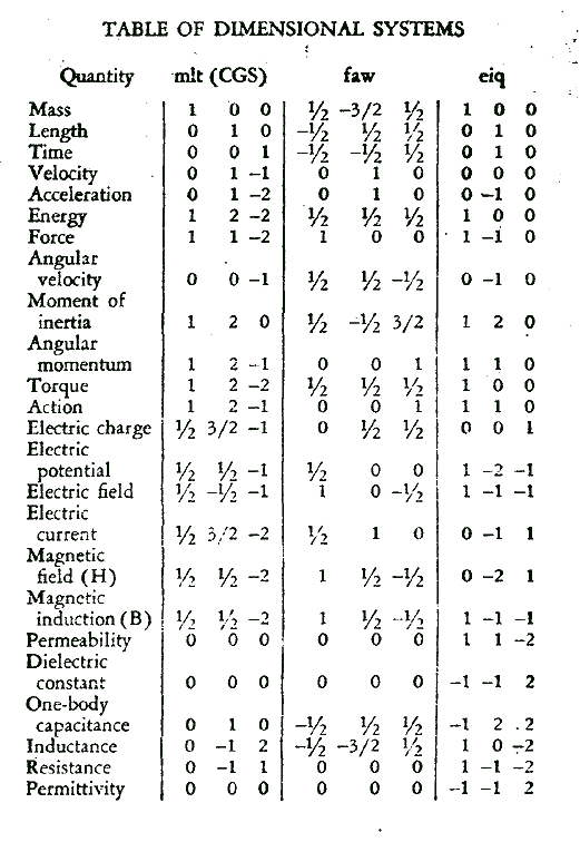 The third column of the table shows an energy-interval-charge (eiq) system of dimensions. It is not converted directly from CGS, but embodies some advantageous features of MKS. You will note that mass has the dimensions which was to be expected, and velocity is dimensionless, which reflects well the fact that velocity is relative. Acceleration comer out to be i-1 and force is ei-1, energy per unit of interval. Not bad. It becomes still more attractive when we see that the eiq system is entirely free of there fractional exponents.