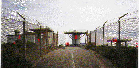 1. Sentry Box and Gate. The integrated fire control area of each Nike missile battery was a secure area surrounded by a barbed wire fence and guarded by armed sentries 24-hours a day. This gate is the only road access to the site, and the sentry box is where the guards were located. Upon a person's arrival at the gate, he/she would be scrutinized closely, and without proper identity papers and a valid reason to be there, that person would be denied entrance and detained for closer scrutiny.